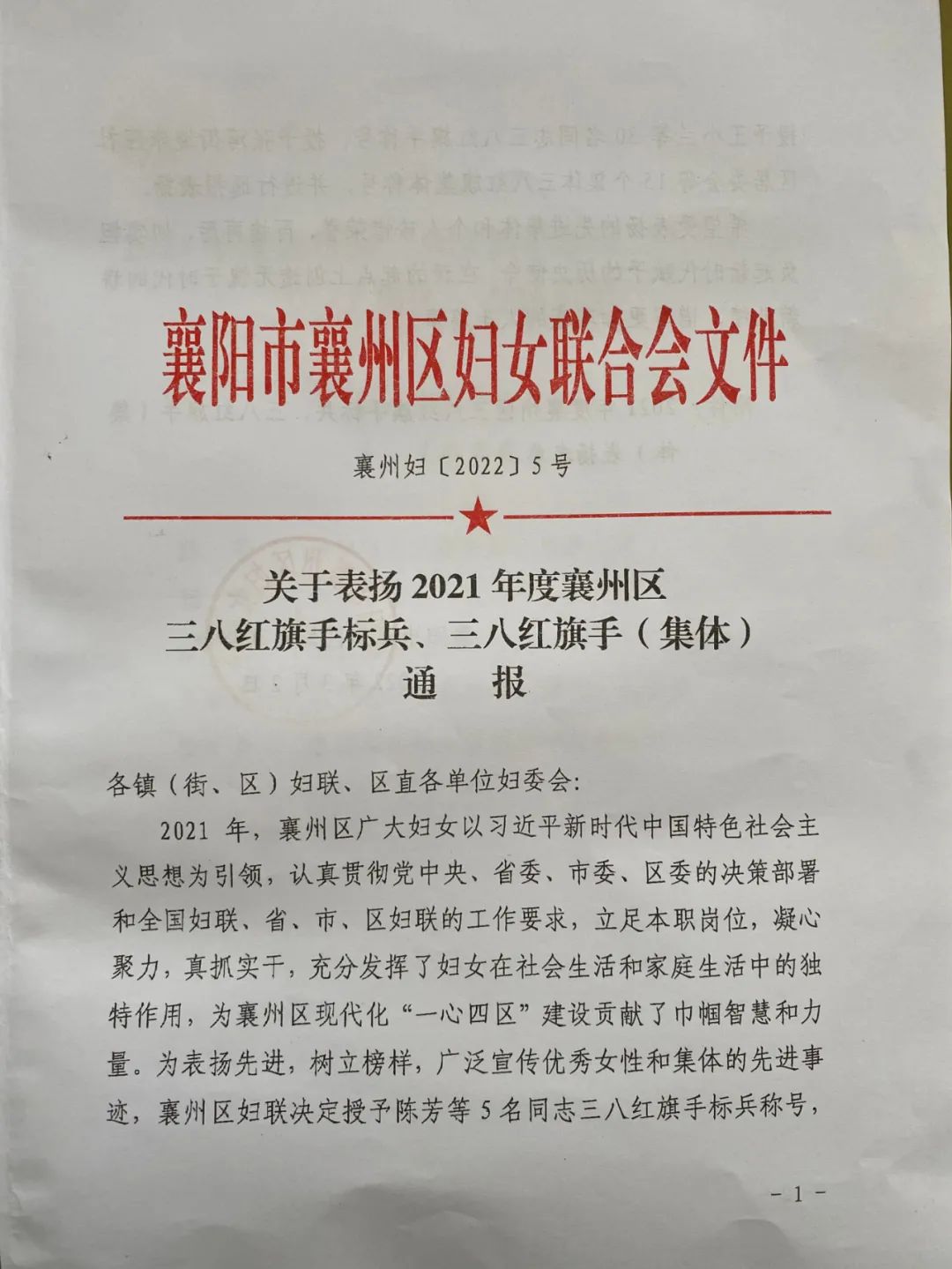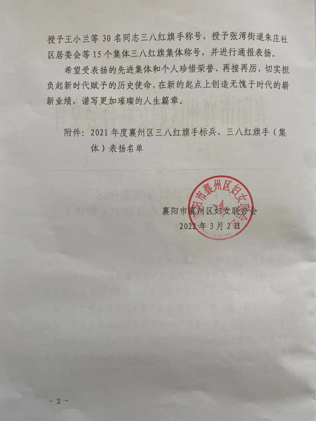 “三八”国际劳动妇女节来临之际,襄州区妇联为表扬先进,树立榜样,对区50名个人及团体进行了表彰。